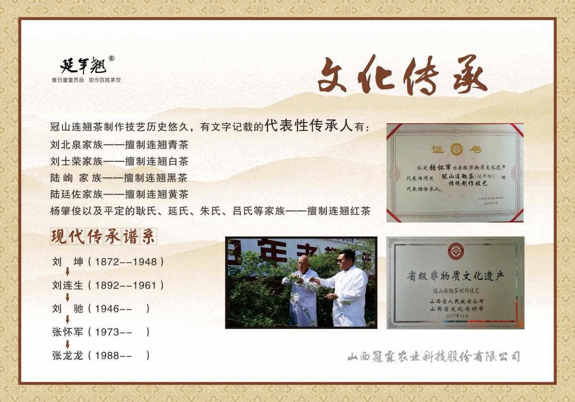 冠山连翘茶(延年翘)制作工艺被列入山西省非物质文化遗产,其独特的“九蒸九晒”工艺,将茶叶的生产、加工环节发挥到极致,经过岁月积淀和发展,目前正在为申请国家级非物质文化遗产做积极准备。