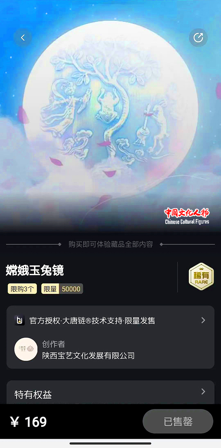 中国文化人物(记者 兰鸿、赵建华)镜致艺术,传世珍品;以文创还原历史,将文脉融入生活。大唐西市博物馆联合陕西宝艺文化发展有限公司、嗨艺购发行平台打造的首款数实结合艺术品——嫦娥玉兔镜,于8月4日12:00上线发行,原定发行周期三天,结果上线第一天就受到市场热捧,被抢购一空。