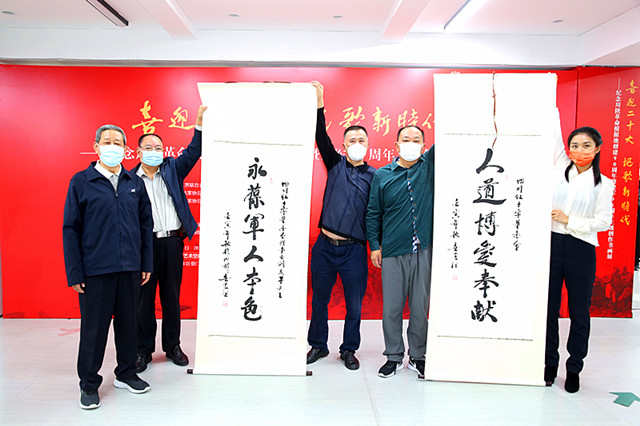 本次书画展座谈会的另一个重要议程是老将军和艺术家们向战斗英雄、老红军后代、爱心企业家和爱心志愿者代表现场赠送墨宝,并与他们合影留念。