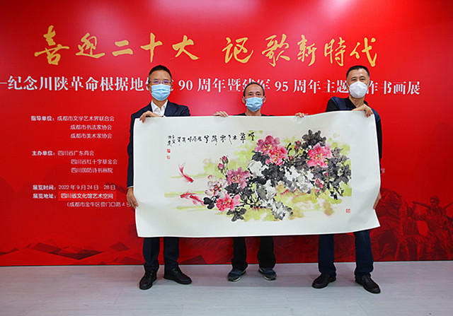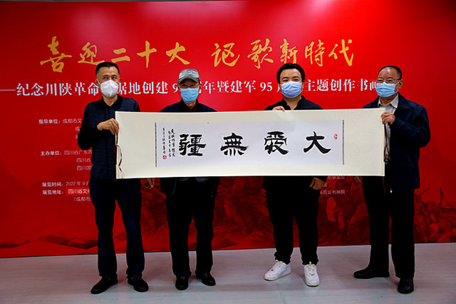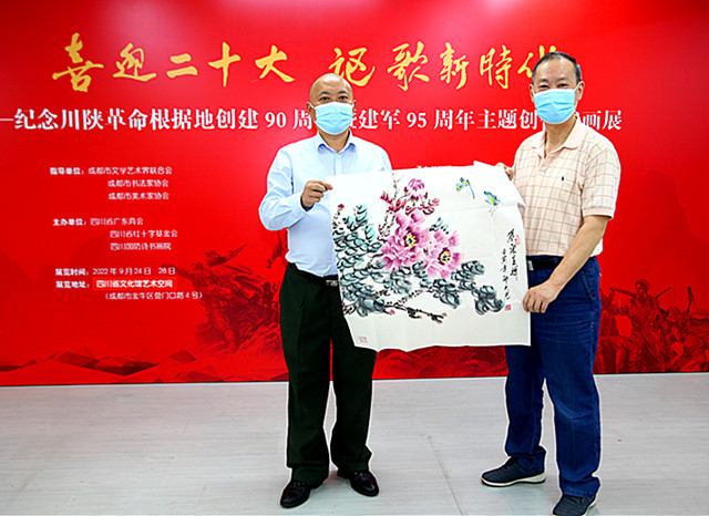 本网2022年9月24日四川成都讯(曹铁 记者刘昕 摄影报道)今年,是中国共产党建党101周年,党的二十大即将召开。今年,是川陕革命根据地创建90周年,又是中国人民解放军建军95周年。为了迎接党的二十大胜利召开,纪念川陕革命根据地创建90周年和庆祝中国人民解放军建军95周年,由成都市文学艺术界联合会、成都市书法家协会、成都市美术家协会指导,由四川国防诗书画院、四川省广东商会和四川省红十字基金会等单位共同举办的“喜迎二十大 讴歌新时代——纪念川陕革命根据地创建90周年暨建军95周年主题创作书画展”于今日在四川省文化馆艺术空间隆重开幕。