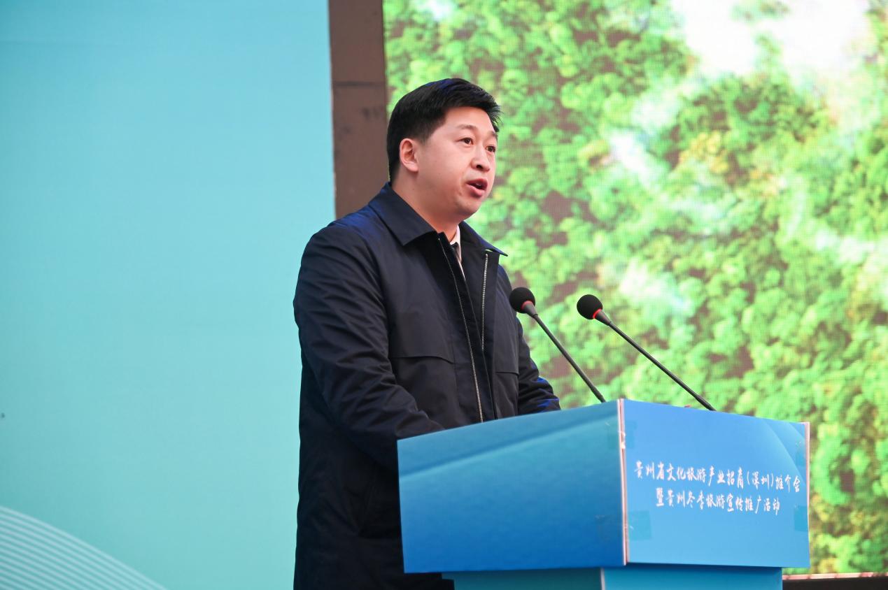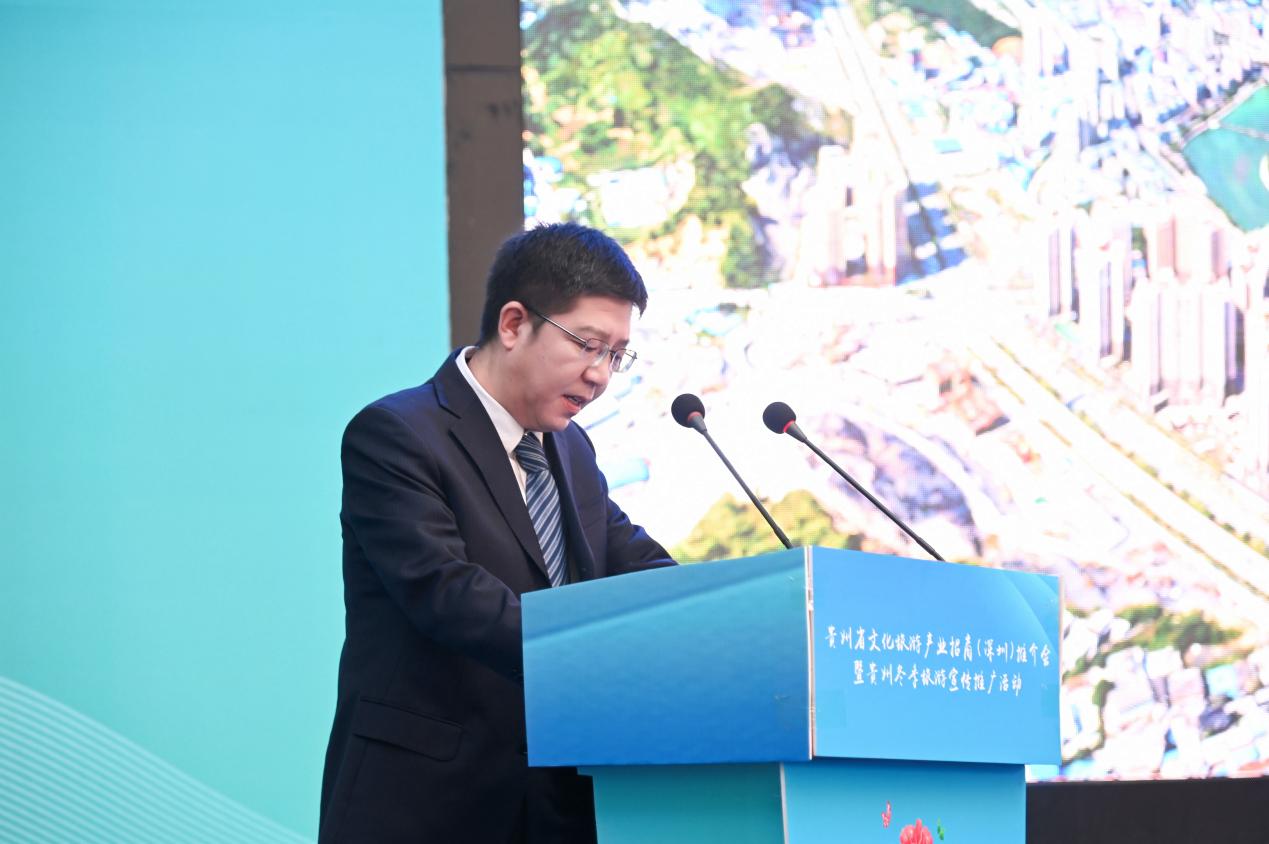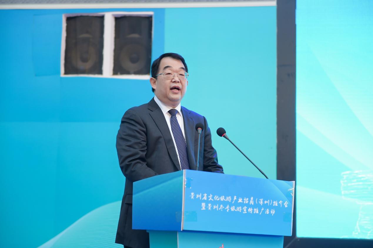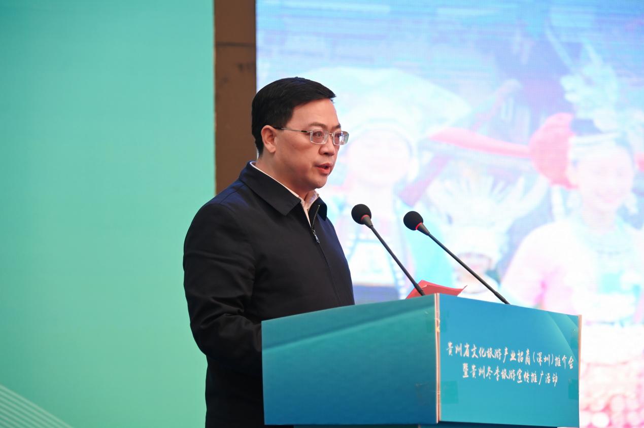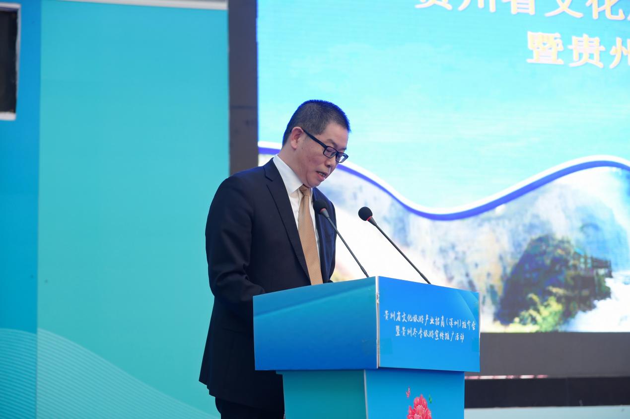会上,贵州省委常委、宣传部部长卢雍政作贵州文旅产业招商推介。他提到,贵州与广东同属泛珠区域,“我住珠江头、君住珠江尾”,两地交流合作源远流长。党的十八大以来,广东坚决贯彻习近平总书记关于东西部扶贫协作的重要指示精神,把帮扶贵州作为重大政治任务,为贵州按时打赢脱贫攻坚战和高质量发展作出了重要贡献,助力贵州创造了赶超进位的“黄金十年”,携手演绎了粤黔版“山海情”。粤黔两省文旅资源各具特色、合作空间巨大、发展前景广阔。愿以文旅产业协作为契机,深化新一轮东西协作,推动粤黔两省合作巩固前缘、再谱新篇,助推国内国际旅游恢复生机、焕发活力。山地公园风景独好,多彩贵州四季俱美。卢雍政部长真诚期待深圳的有识之士到贵州参观考察、休闲度假、投资兴业,同念山海经、合奏共赢曲、共圆强国梦。