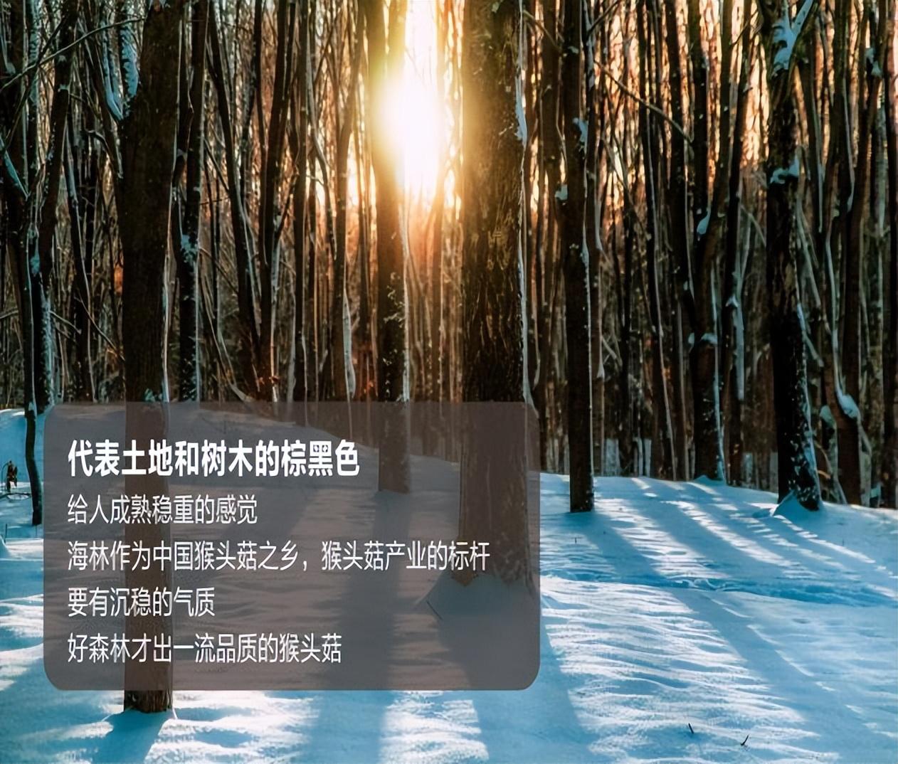 色彩五代表土地和树木的棕黑色:给人成熟稳重的感觉海林作为中国猴头菇之乡,猴头菇产业的标杆要有沉稳的气质好森林才出一流品质的猴头菇