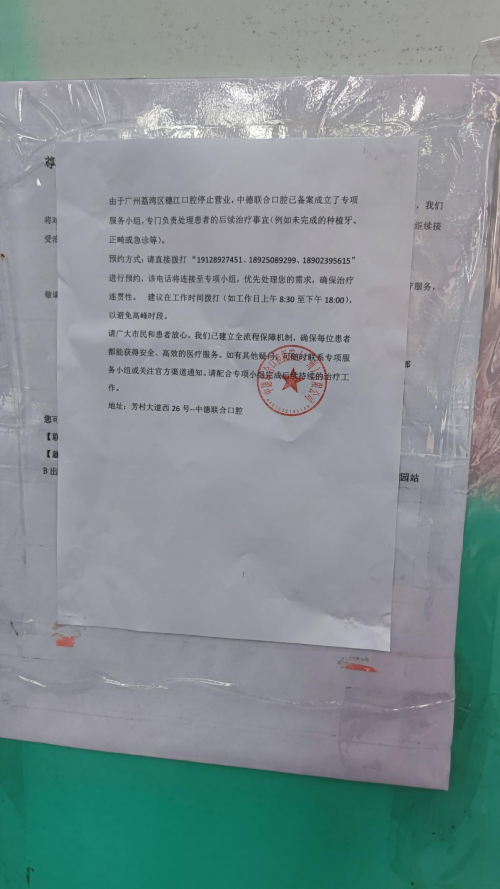 中德联合口腔医院表示:“我们已经与停诊口腔签订转诊协议,并在上级管理部门备案,并建立全流程保障机制,确保每位患者都能获得安全、高效的医疗服务。所有停诊口腔的顾客都由我们接手,并已做好转诊患者告知工作。”